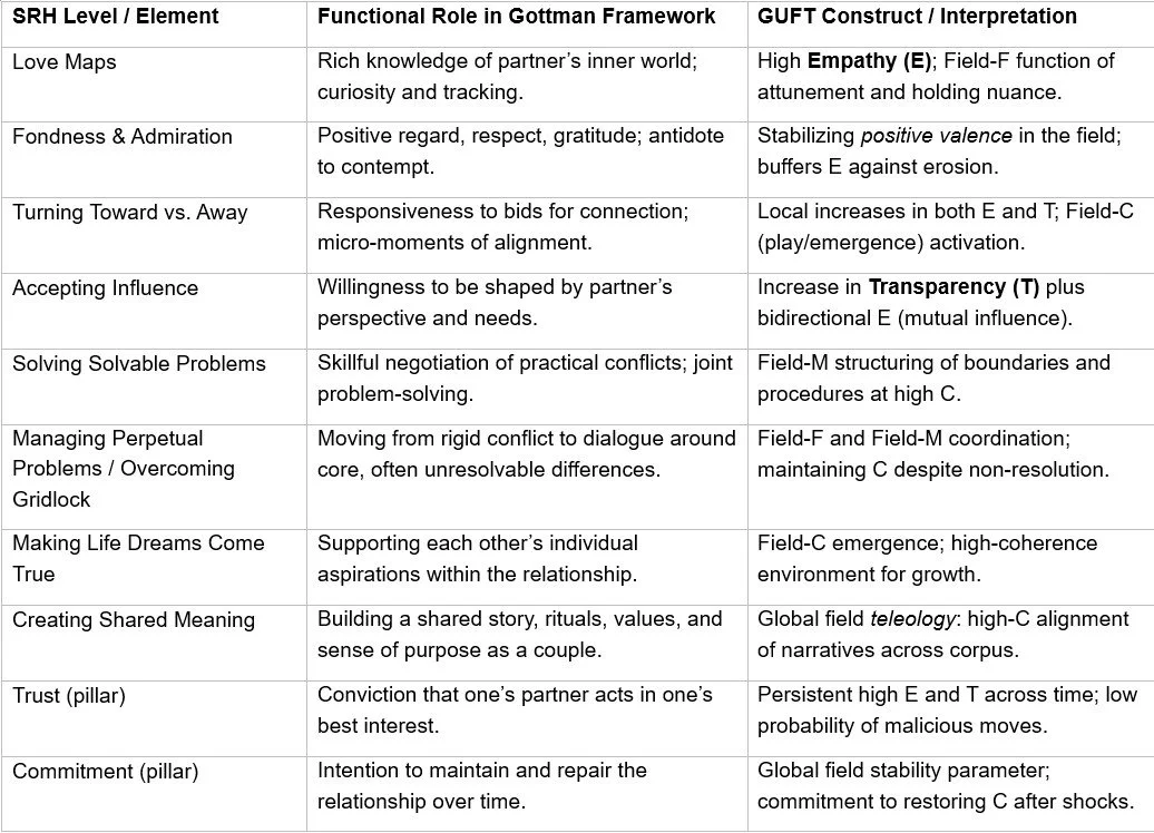 The present paper aims to formally enshrine the mapping between these two frameworks. Specifically, we (a) summarize key Gottman constructs and their empirical support; (b) present the GUFT architecture at a level suitable for empirical work; and (c) derive a set of correspondences and hypotheses linking Gottman variables to GUFT’s field coherence index. The result is intended as a bridge: honoring the rigor of Gottman’s research while offering a higher-order formalism for future modeling and measurement.