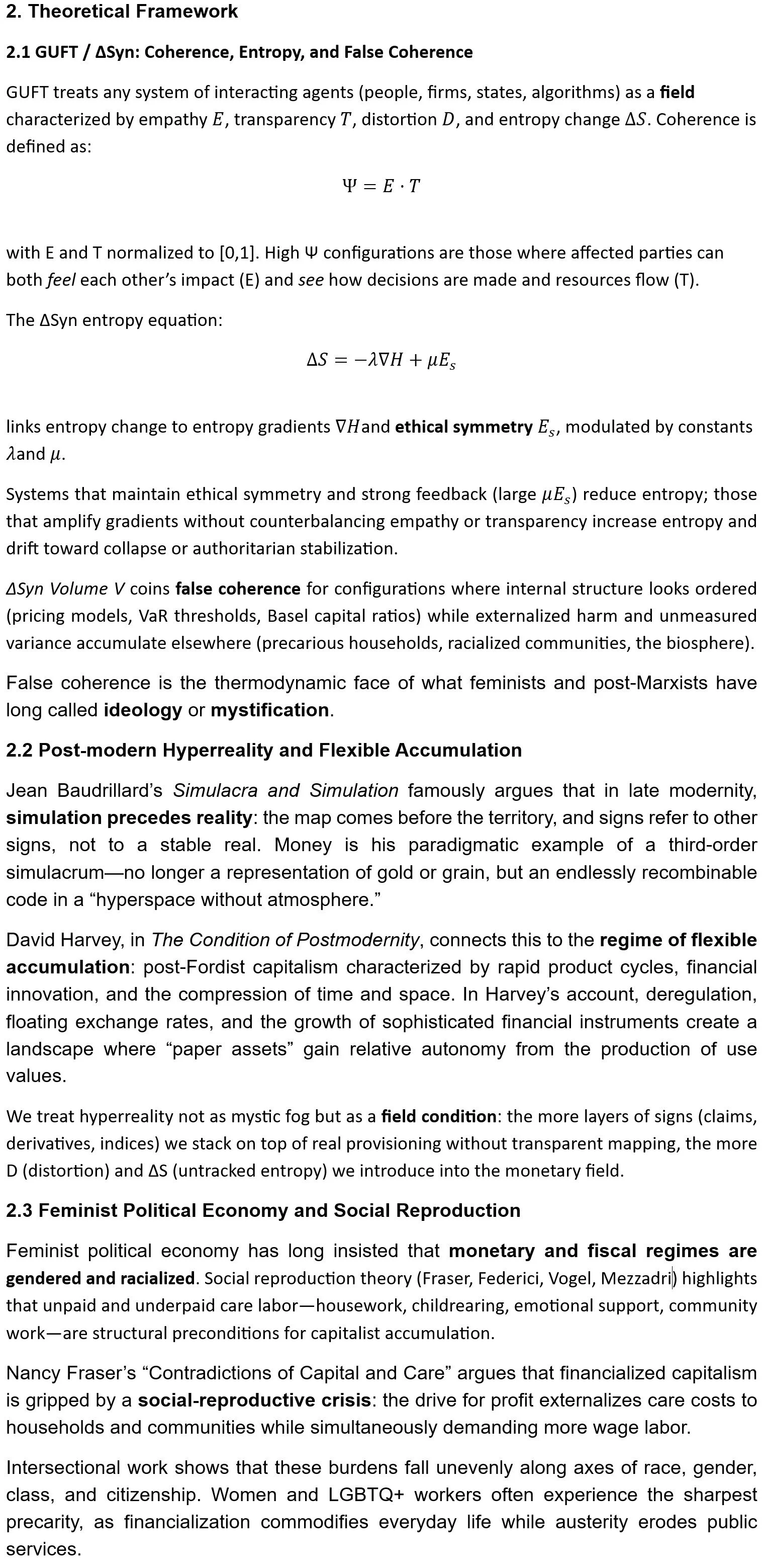 Applied to money, Ψ describes whether monetary infrastructures stabilize human and ecological life, or whether they create false coherence—local order purchased by exporting entropy to others. Building on our internal work An Audit of Meaning – Money, Hyperreality, and Fractional Reserve Finance, The Atheist’s Audit, and ΔSyn Volumes V–VI, we show how fractional-reserve banking, financialization, platform money, and emerging crypto/CBDC architectures can be understood as fields whose dynamics are illuminated by post-modern hyperreality (Baudrillard), Marxist and post-Marxist political economy (Harvey, Minsky, Graeber), feminist and intersectional analyses of social reproduction (Fraser, Federici, Mezzadri), and critical work on race, gender, and finance.