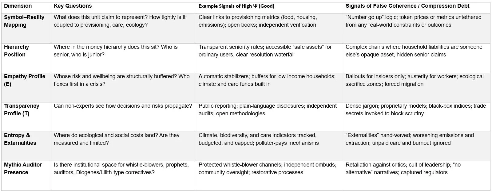 Our An Audit of Meaning – Money paper provides a field-guide table that evaluates past and proposed regimes using qualitative Ψ/ΔS ratings.