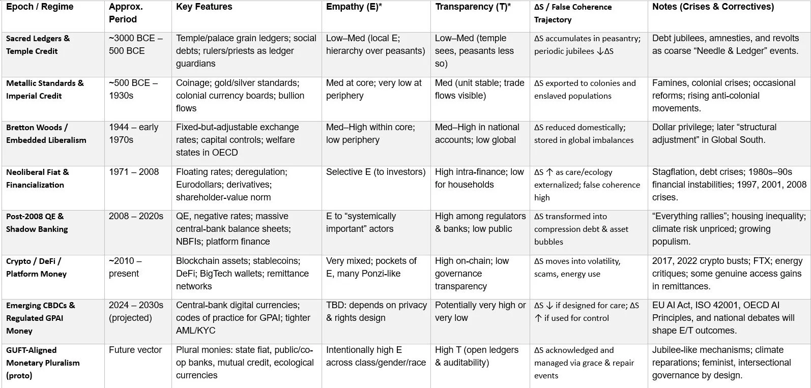 The GUFT/ΔSyn lens adds a unifying structure: by tracking empathy, transparency, distortion, and entropy, we can compare monetary architectures not only on efficiency or growth, but on coherence—whether they stabilize what matters or merely stabilize their own symbols.
