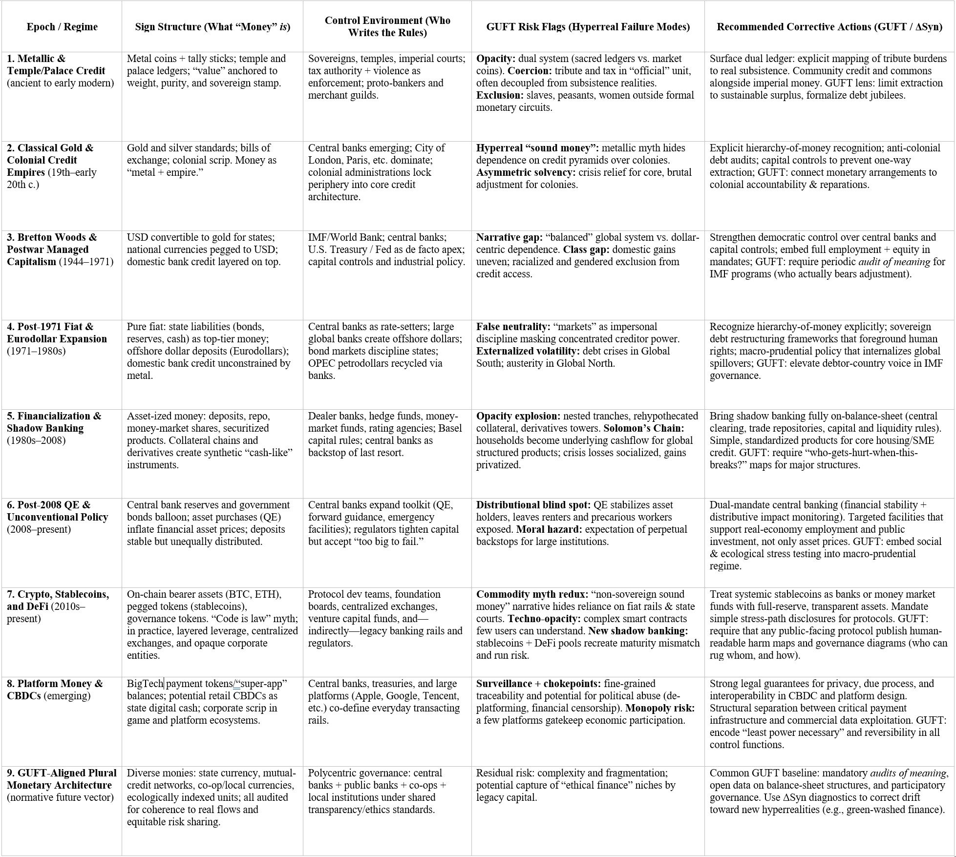 In crises, private promises at lower tiers are often converted into higher-tier assets through central bank backstops, emergency lending, and government guarantees. This behavior reveals what GUFT would call the true control structure: states and central banks are the ultimate writers of the monetary symbol set, even in ostensibly “market-driven” systems.