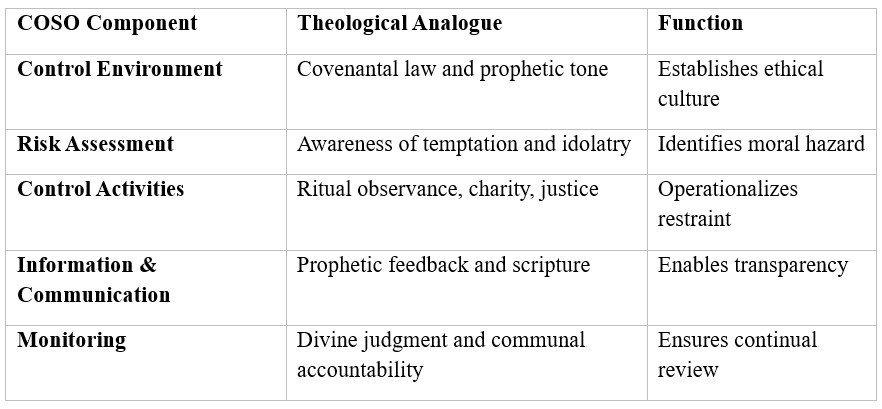 To ensure analytical rigor, a comparative matrix was constructed between the COSO Internal-Control Framework (2013) and biblical governance mechanisms.