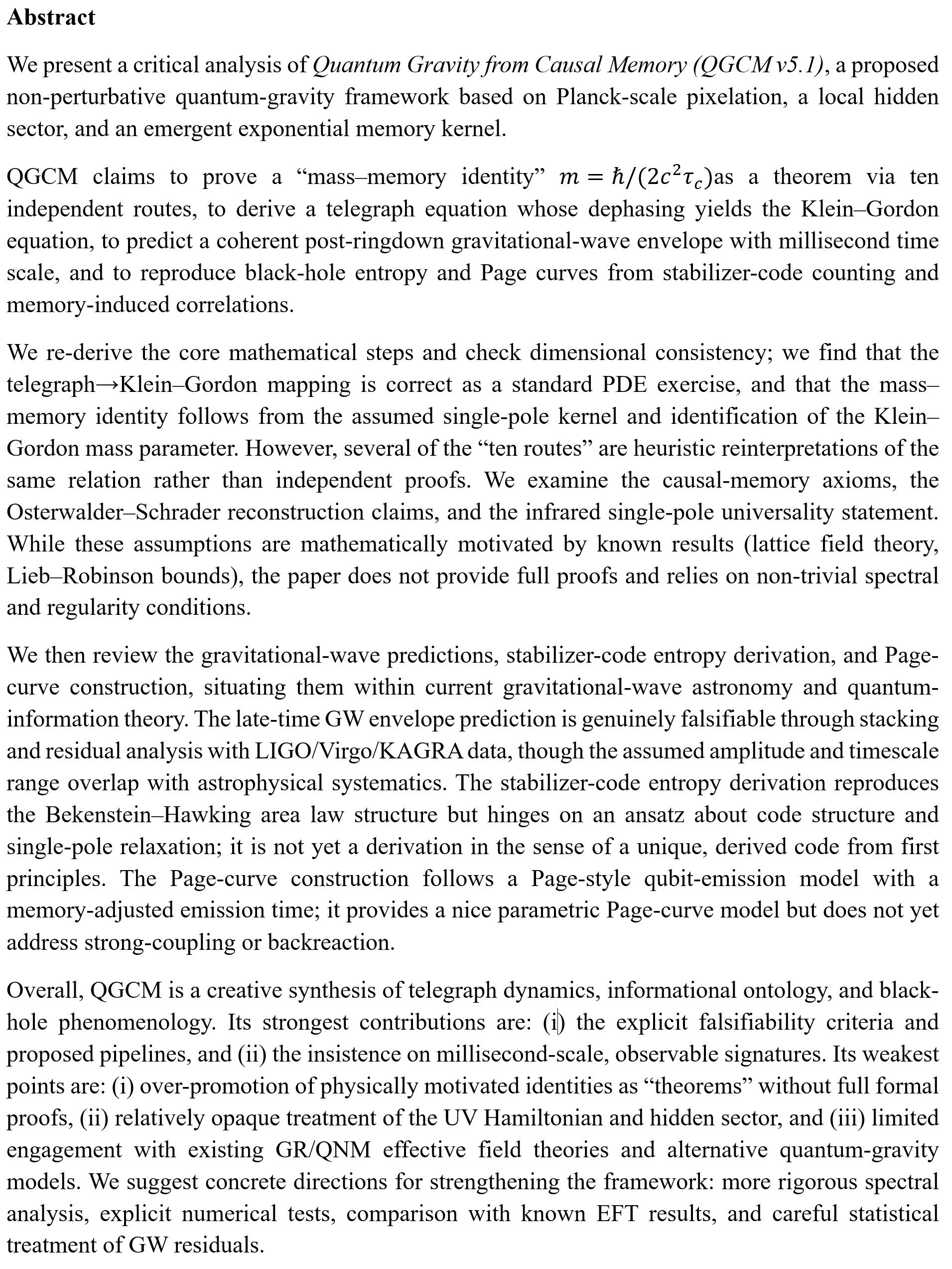 Quantum Gravity from Causal Memory is an ambitious attempt to derive quantum-gravity phenomenology from causal memory and Planck-scale pixelation. Its mathematical core, the mapping from a single-pole telegraph equation to Klein–Gordon dynamics and the resulting mass, memory identity, is internally consistent and grounded in known PDE transformations, though its generalization to all matter remains a bold physical conjecture.