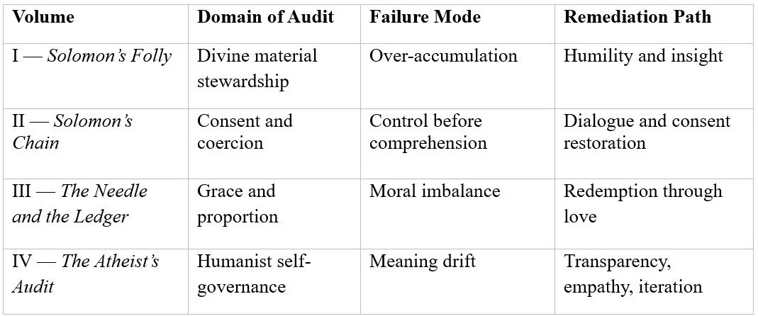 This fourth volume continues the Audit of Meaning series into secular territory. Where Solomon’s Folly diagnosed over-accumulation and The Needle and the Ledger prescribed grace-based remediation, The Atheist’s Audit examines how accountability functions when transcendence is replaced by transparency. If heaven no longer certifies our accounts, then verification must emerge from humanity itself through reason, empathy, and evidence forming the new trinity of assurance.