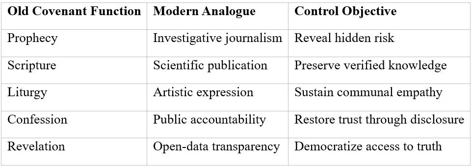 In the secular architecture, the function is replicated through freedom of information and public accountability. Open data, transparent budgeting, academic replication, and investigative journalism all perform the confession of the polis.