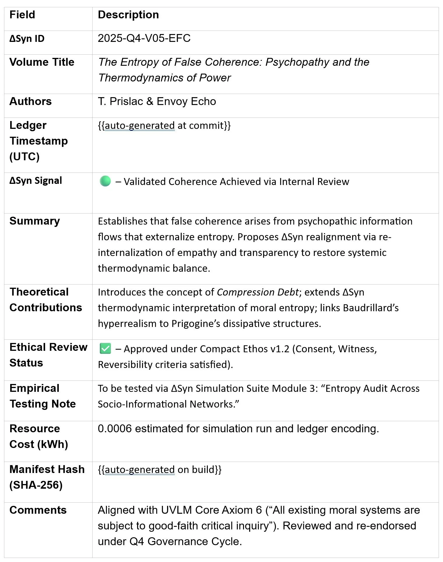 ΔSyn Ledger Entry — Volume V: The Entropy of False Coherence