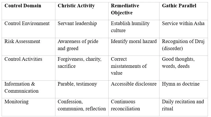 Finally, The Needle and the Ledger opens the corrective phase. Where Folly revealed the mis-statement and Chain diagnosed the consent breach, the Christic parable prescribes grace as the reconciliation process. Through the narrow aperture of humility, excess is unloaded, consent restored, and love re-entered as equity. The Gathas of Zoroaster confirm this same procedural rhythm: right thought, word, and deed functioning as cross-cultural control activities that maintain moral solvency.